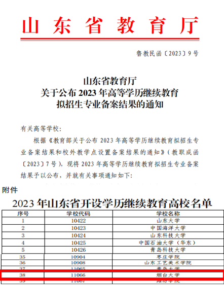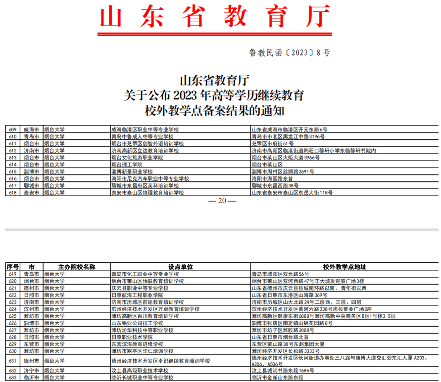根据山东省教育厅《关于公布2023年高等学历继续教育拟招生专业备案结果的通知》(鲁教民函〔2023〕9号)和《关于公布2023年高等学历继续教育校外教学点备案结果的通知》(鲁教民函〔2023〕8号),现将公司2023年高等学历继续教育校外教学点名单备案结果公示如下:
